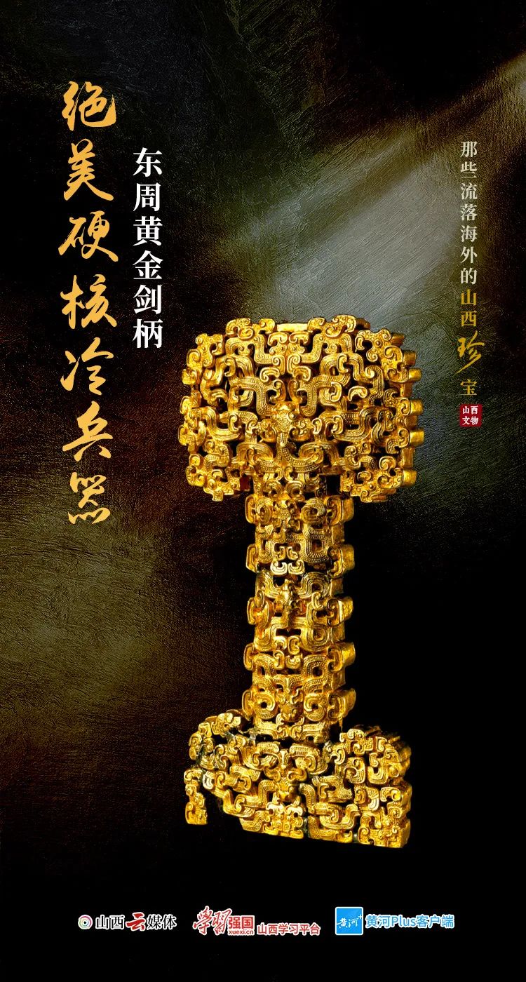 這把黃金劍柄,制作于公元前6至5世紀(jì),長度9.8厘米,為鏤空雕刻蟠虺紋,做工精細(xì),華麗異常。