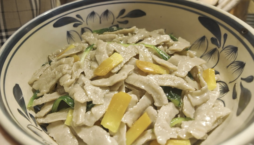 當(dāng)然,最好用的工具當(dāng)屬做面的“魔法棒”——手指。用手指將莜面的小面團(tuán)搓成橄欖形,上鍋一蒸,就成了“莜面魚魚”;將面團(tuán)放在砧板上,用手掌后部往前推壓成薄片,就成了“栲栳栳”;將面團(tuán)分切成小面丁以后,用大拇指一抿,就成了“貓耳朵”;將小麥面加一兩種雜糧面混勻后和成較軟的面團(tuán),勻速將面擠壓出手指縫,就成了“握流流”。在“魔法棒”的作用下,面團(tuán)變成了各式各樣的美餐,給山西人帶來(lái)了無(wú)盡舌尖上的享受。