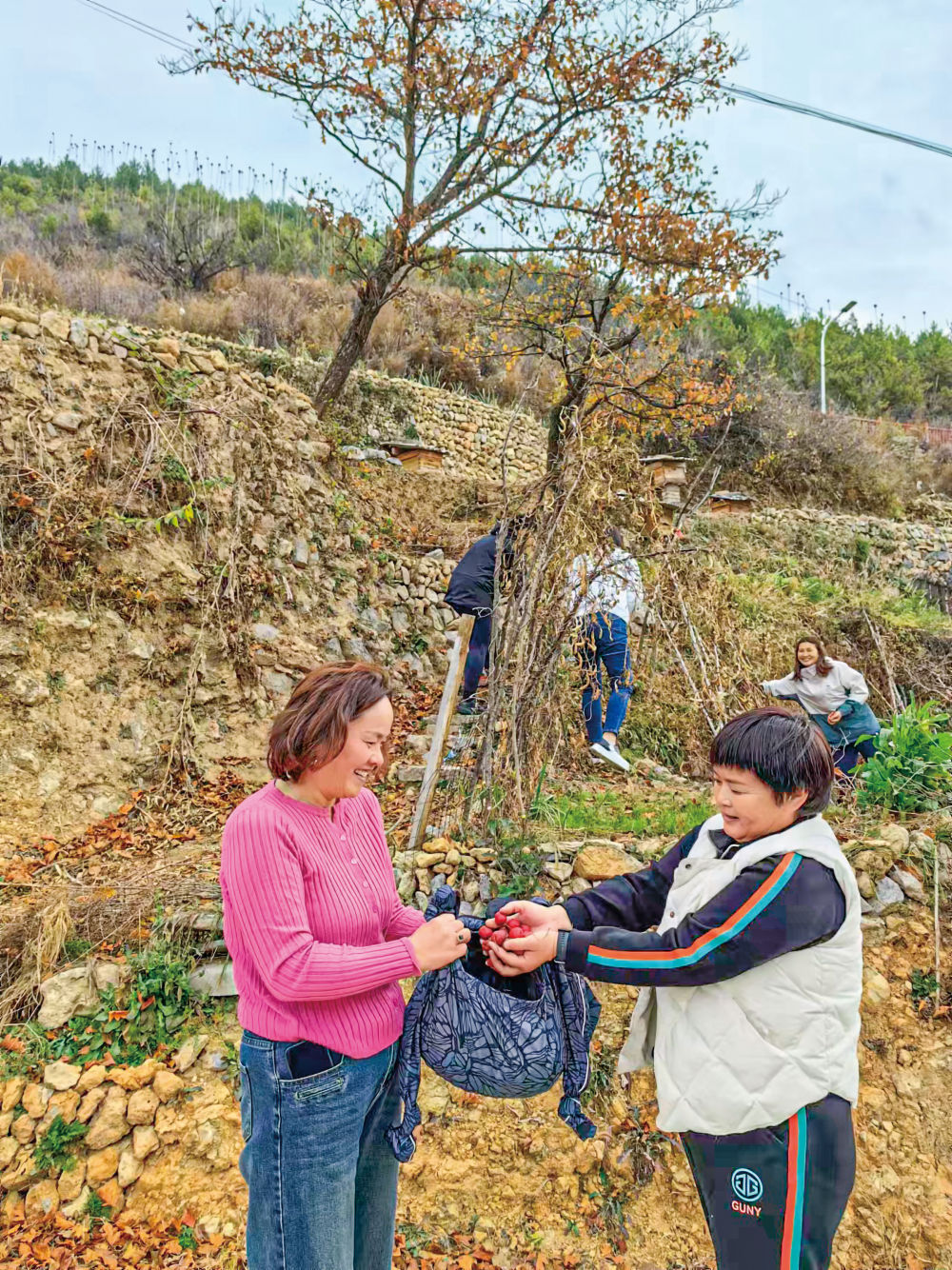 徜徉在小路上,偶遇從河南新鄉(xiāng)長(zhǎng)垣市自駕而來的游客于女士一行人,她們正在山坡上采摘?jiǎng)倓偸焱傅纳介?。于女士告訴記者,她們這幾個(gè)鄰居經(jīng)常自駕來松廟村游玩,夏天時(shí)還常在村里小住。