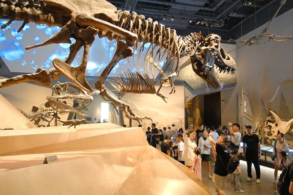 8月21日,浙江湖州,游客在恐龍館內參觀。暑假進入尾聲,位于湖州市安吉縣的浙江自然博物院熱度不減。視覺中國供圖