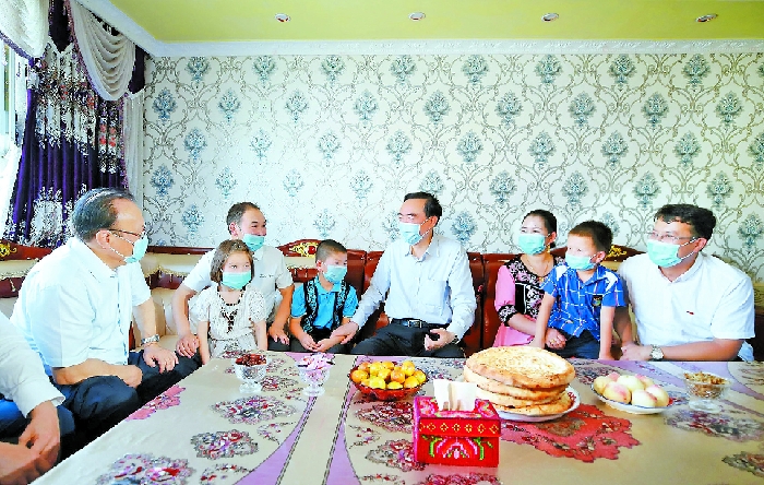 日前,自治區(qū)黨委書記陳全國,自治區(qū)黨委副書記、自治區(qū)主席雪克來提·扎克爾在克孜勒蘇柯爾克孜自治州調(diào)研統(tǒng)籌推進(jìn)常態(tài)化疫情防控和經(jīng)濟(jì)社會(huì)發(fā)展工作。這是陳全國、雪克來提·扎克爾在阿克陶縣絲路佳苑易地扶貧搬遷安置點(diǎn),走進(jìn)建檔立卡貧困戶穆拉提·艾海提家中,關(guān)心詢問搬遷后的生活情況,勉勵(lì)他們持續(xù)增收致富,把日子越過越好。 崔志堅(jiān)攝