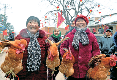 ▲村民展示自家養(yǎng)的土雞。1月16日,河南郟縣前莊村葫蘆套老街舉辦特色年貨大集,以及“話脫貧、感黨恩、謀發(fā)展”鄉(xiāng)村春晚活動。新華社發(fā)(郝源攝)