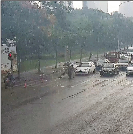 當老人好不容易快走到馬路對面時,天公不作美,突然下起瓢潑大雨,又一幕感人的瞬間出現了:一輛等候通行的小轎車上下來一名女司機,從后備廂拿出一把雨傘后,快步跑上前,遞到老人手里。