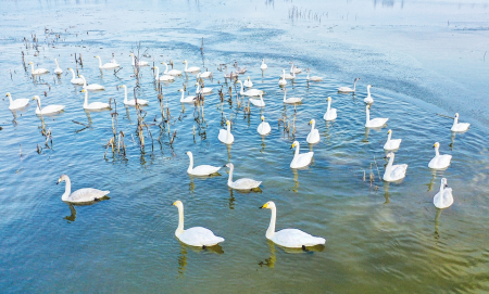 白天鵝來平陸黃河濕地過冬,從一 開始的幾百只到去年近1.6萬只,背后是平陸縣的不斷努力。何建喜介紹,為讓天鵝愜意棲息,平陸縣在濕地周圍搭建隔離網(wǎng)、懸掛警示牌,并種上了小麥、大豆等農(nóng)作物,確保天鵝有充足的越冬食物。同時,還設(shè)立了兩個白天鵝巡護站,安裝了遠程監(jiān)控系統(tǒng),平陸縣林業(yè)局等部門聘用20余名專職人員全天候巡護,定點、定量投食。