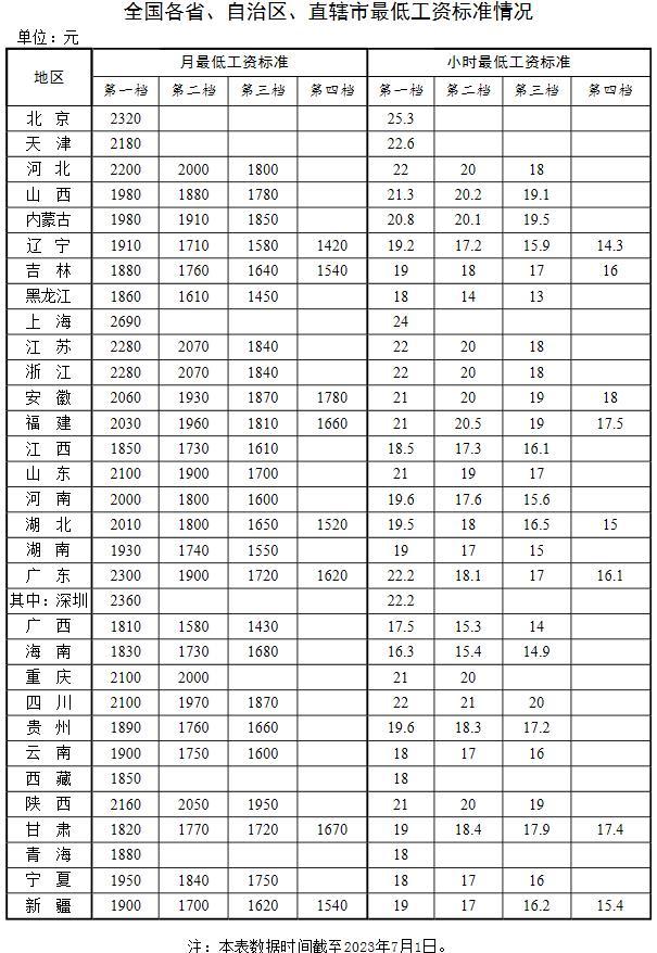 人社部官網(wǎng)近日公布了全國各省、自治區(qū)、直轄市最低工資標準情況(截至2023年7月1日),其中,剛剛上調(diào)最低工資標準的上海,月最低工資標準繼續(xù)穩(wěn)居全國首位。