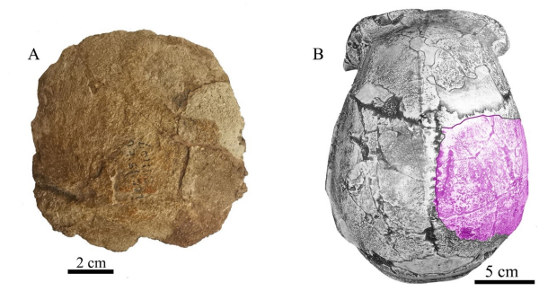 周口店第15號(hào)地點(diǎn)發(fā)現(xiàn)的人類頂骨化石。左側(cè):頂骨化石外側(cè)面觀;右側(cè):周口店直立人頭蓋骨模型頂面觀,示頂骨化石位置。圖片來(lái)源:中國(guó)科學(xué)院官網(wǎng)