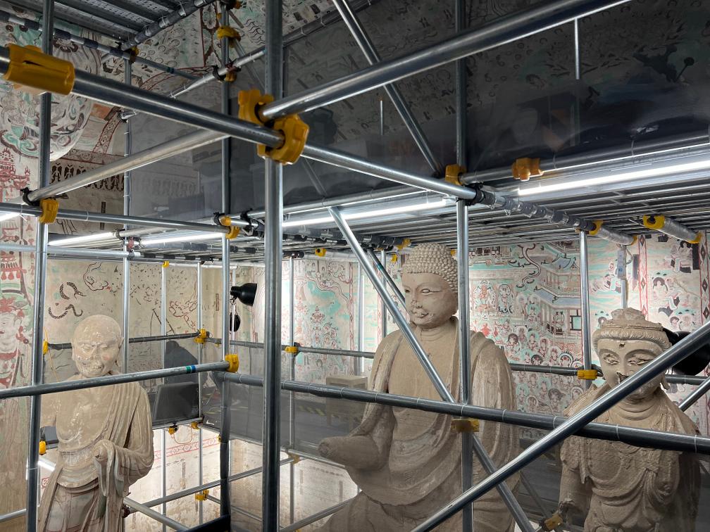第351窟內,第四代壁畫高保真自動拍攝設備正在對壁畫進行分區(qū)域采集成像,400多平方米的壁畫需要采集三四個月。