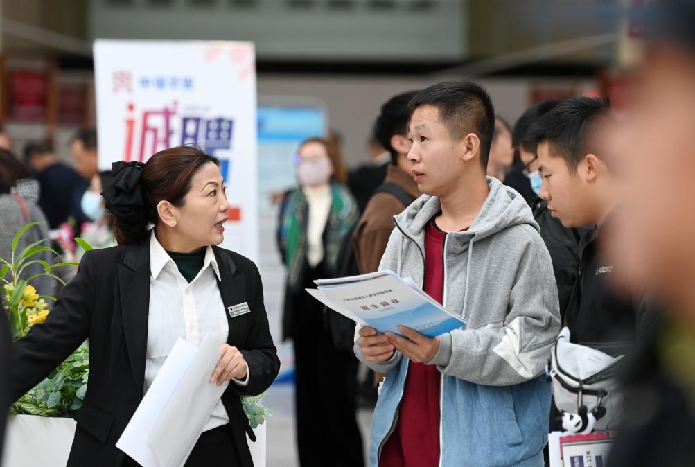 2023年11月10日,天津,求職者在招聘會現(xiàn)場與用人單位交流。新華社記者 趙子碩 攝