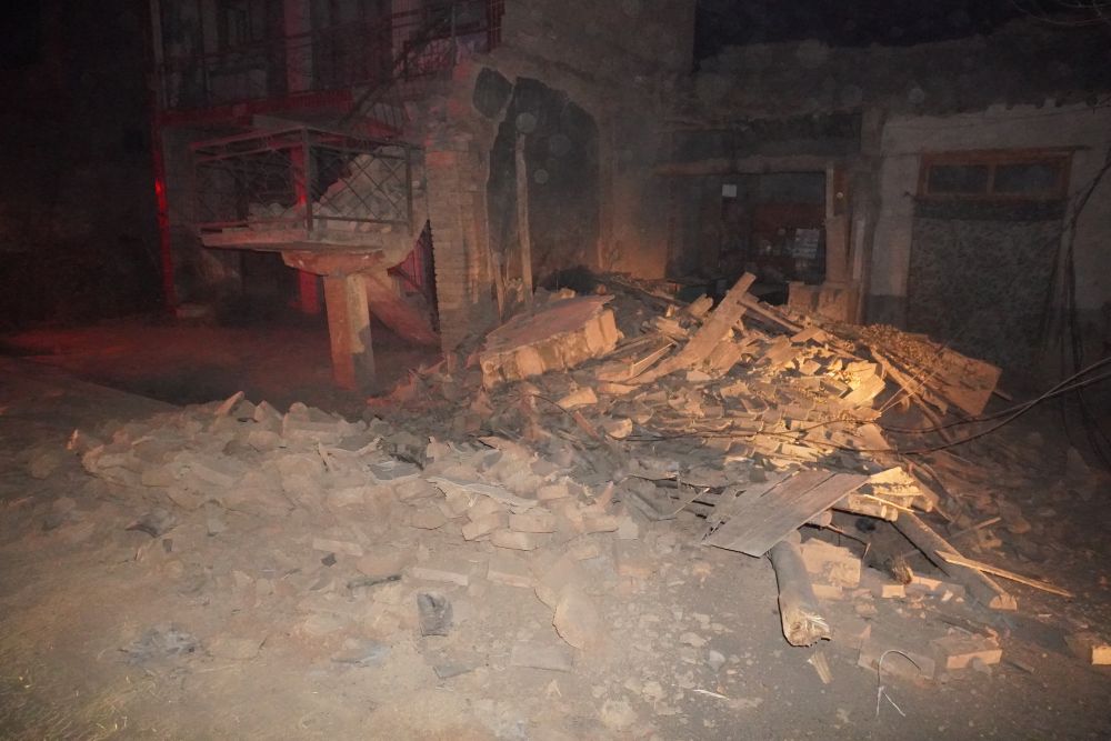 ↑ 12月19日凌晨在甘肅省臨夏回族自治州積石山保安族東鄉(xiāng)族撒拉族自治縣大河家鎮(zhèn)陳家村拍攝的一處倒塌的房屋。新華社記者馬希平攝