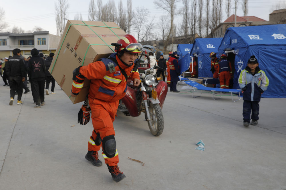 ↑ 12月19日,在甘肅臨夏積石山縣大河家鎮(zhèn)大河村安置點(diǎn),消防人員在搬運(yùn)救援物資。新華社記者方欣攝