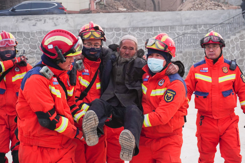 ↑ 12月19日,在甘肅省臨夏回族自治州積石山保安族東鄉(xiāng)族撒拉族自治縣大河家鎮(zhèn)大河村,消防人員開展救援。新華社記者馬希平攝
