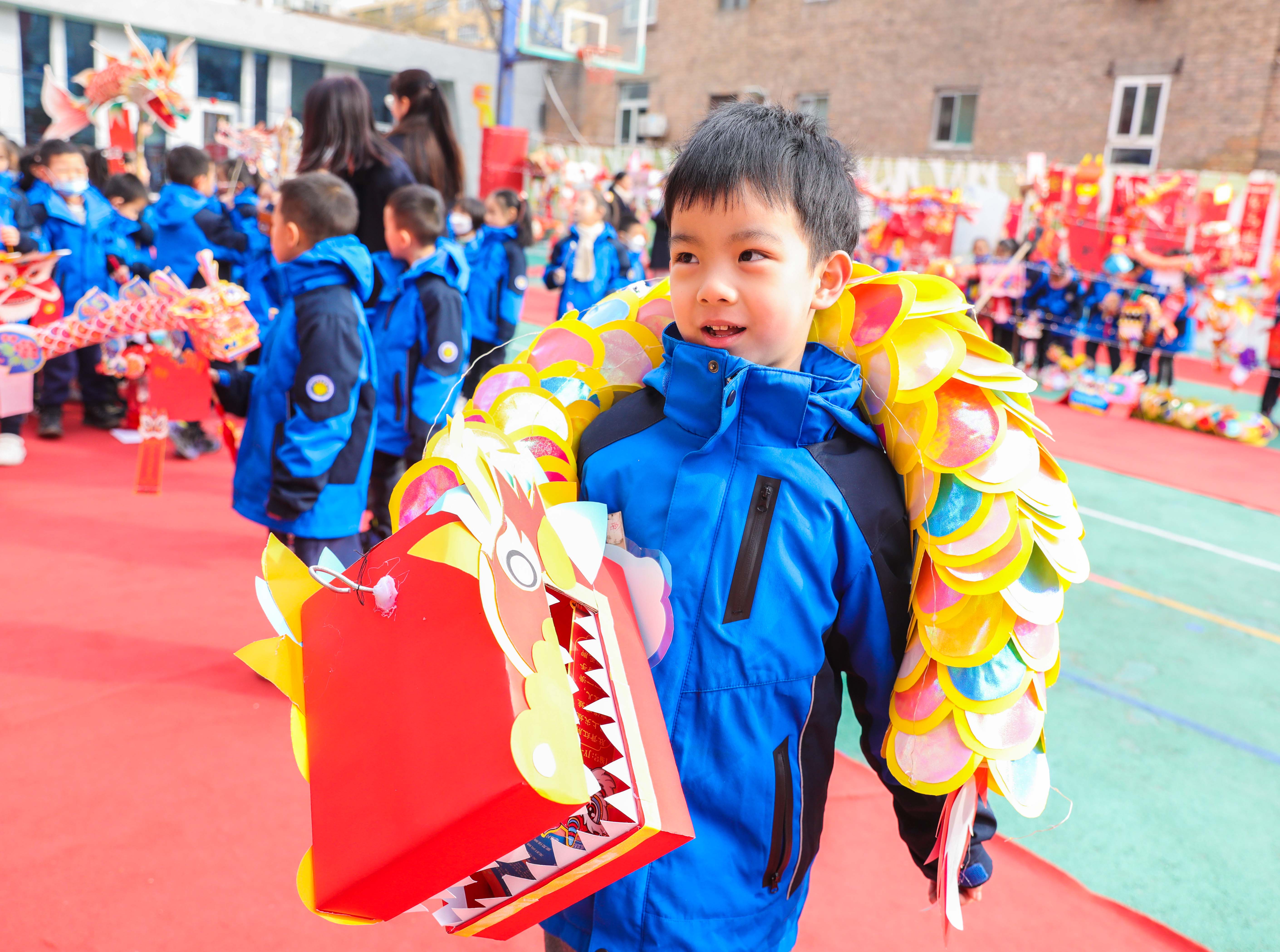 老師們精心布置的國潮風(fēng)操場,無疑是該校開學(xué)首日的一大亮點。操場上鋪著紅地毯,正中央是一長溜兒形態(tài)各異、栩栩如生的龍燈,兩側(cè)是一幅幅紅紅的春聯(lián)和一面面“?!弊謮?。龍年大吉、魚躍龍門等祝福語隨處可見。滿滿的龍元素,點綴出紅紅火火的新氣象。