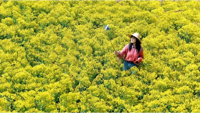 4月14日,在萬榮縣西村鄉(xiāng)望囑村的板藍根花地里游人在踏青賞花,親近自然。西村鄉(xiāng)到處都是板藍根花開放,競相爭艷,連成一片花?!?/p>