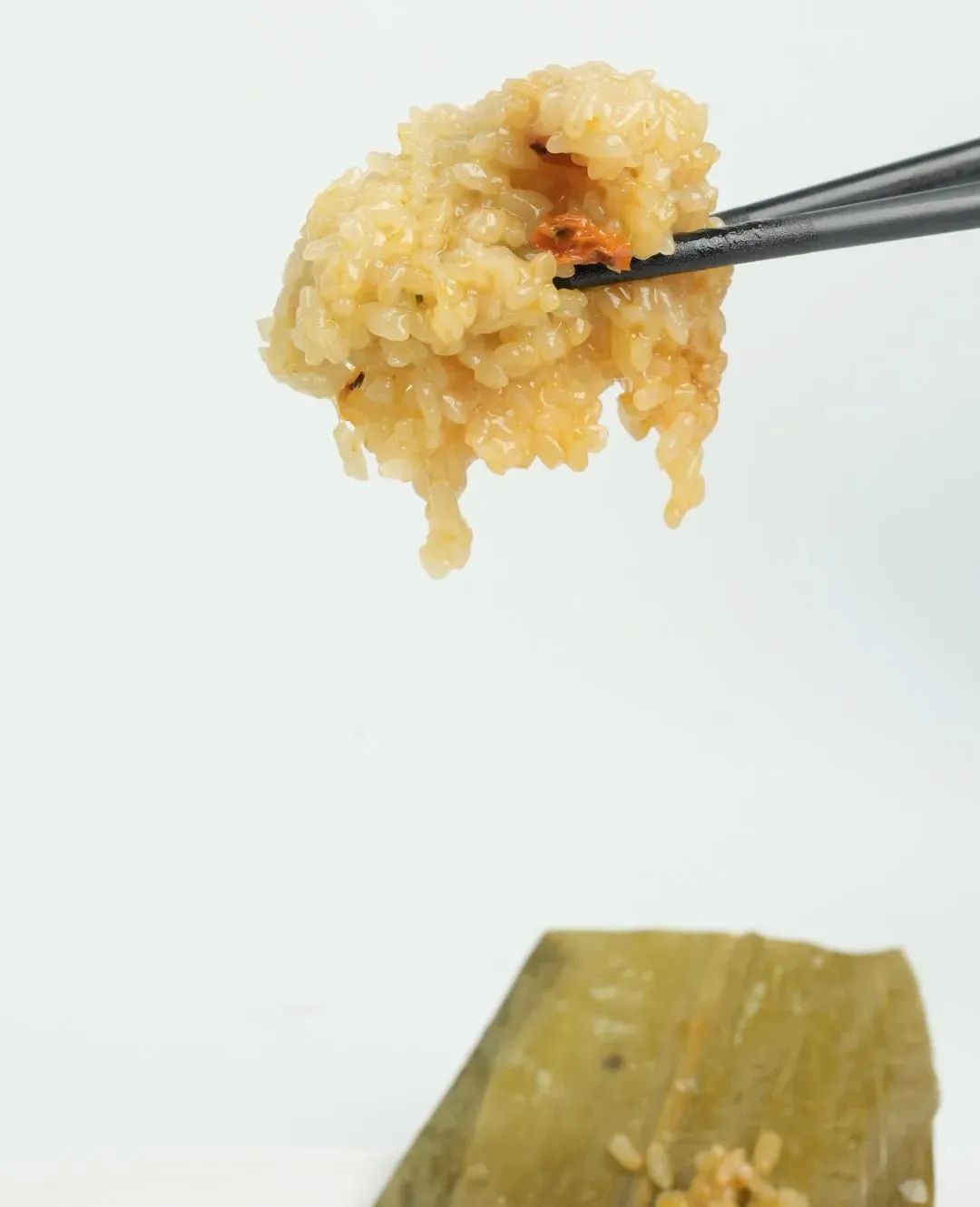 剝開(kāi)以后,先是聞到江米的香味,剝開(kāi)兩半,就能感受到何謂酸香撲鼻!吃起來(lái)也是甜中帶酸,酸中帶香,和傳統(tǒng)的粽子大不一樣。