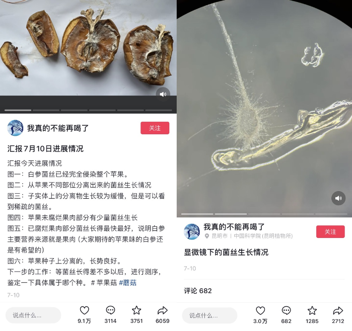 拿到樣本后,許博士對(duì)蘋果做了切片觀察,還在抖音上向網(wǎng)友實(shí)時(shí)更新起了菌絲生長情況,引發(fā)越來越多網(wǎng)友的“追更”。之后又有科普創(chuàng)作者@植物眼 專門采訪許博士的導(dǎo)師趙琪,他的細(xì)致講解讓很多網(wǎng)友紛紛表示“又學(xué)到了新知識(shí)”。