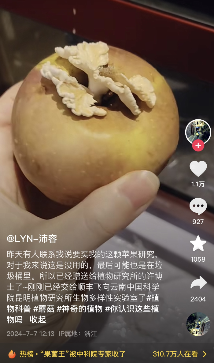 一顆“長菌蘋果”的奇幻漂流,引發(fā)了媒體聚焦。據(jù)潮新聞報(bào)道,上個(gè)月末,浙江梅雨不斷。浙江德清的鄧小姐發(fā)現(xiàn),家里放了一個(gè)多月的蘋果上,竟長出了白色的蘑菇。她在抖音上曬出圖片,登上抖音熱榜,那顆“長菌蘋果”被網(wǎng)友戲稱為“果菌王”。
