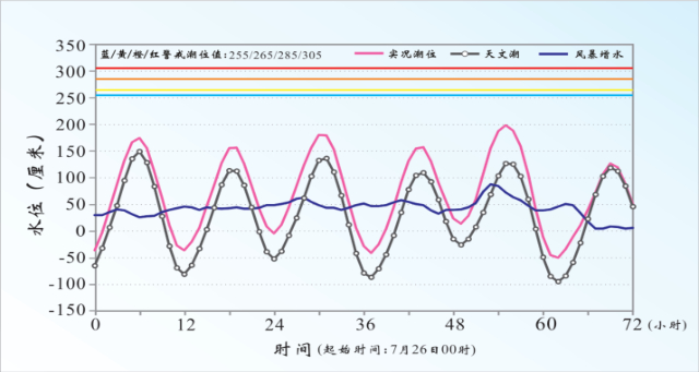 2023年7月28日“杜蘇芮”臺風(fēng)風(fēng)暴潮發(fā)生時(shí),福建東山站實(shí)測潮位、天文潮和風(fēng)暴增水隨時(shí)間變化情況,圖中清晰地反映出風(fēng)暴潮與天文潮疊加后,實(shí)時(shí)潮位明顯升高。(資料來源:《2023中國海洋災(zāi)害公報(bào)》)
