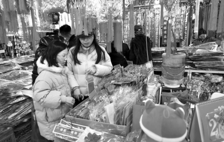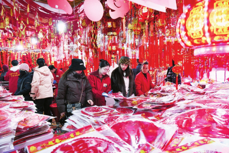 “今年蛇年,對(duì)聯(lián)和掛飾肯定以蛇元素為主,品類(lèi)更加豐富,背膠和磁吸設(shè)計(jì),掛貼更為方便?!痹谔炒筚u(mài)場(chǎng),邢先生售賣(mài)春聯(lián)和窗花、燈籠等各類(lèi)春節(jié)掛飾20多年了,一副副大紅的春聯(lián)掛滿(mǎn)了兩面墻壁,各類(lèi)福字和掛飾鋪滿(mǎn)了整個(gè)攤位,顧客們正在選購(gòu)自己喜歡的春聯(lián)和掛飾。他說(shuō),今年的春聯(lián)和春節(jié)掛飾有大幾百種,豐富多樣。臘八過(guò)后,來(lái)購(gòu)買(mǎi)對(duì)聯(lián)和過(guò)年掛飾的人就開(kāi)始多了起來(lái),預(yù)計(jì)年前一周左右會(huì)達(dá)到高峰。