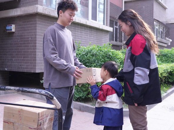 母子倆戴上頭盔,奔赴第一個派送點。到達小區(qū)后,面對要送2件、取1件的任務(wù),辰辰興奮地自告奮勇抱起快遞跑進樓道,卻很快被現(xiàn)實“上了一課”——沒有電梯,收件人住在5層。當他送完這家,額頭滿是汗水,步伐也明顯跟不上媽媽了。出了小區(qū),辰辰一句“真累呀,還有那么多,得送到啥時候啊”,道出了孩子對媽媽工作艱辛的初步體會。而閆詩琪輕撫兒子頭說道,“孩子,干啥工作也要有耐心?!辈粌H是對兒子的鼓勵,更是她日常工作的真實寫照。