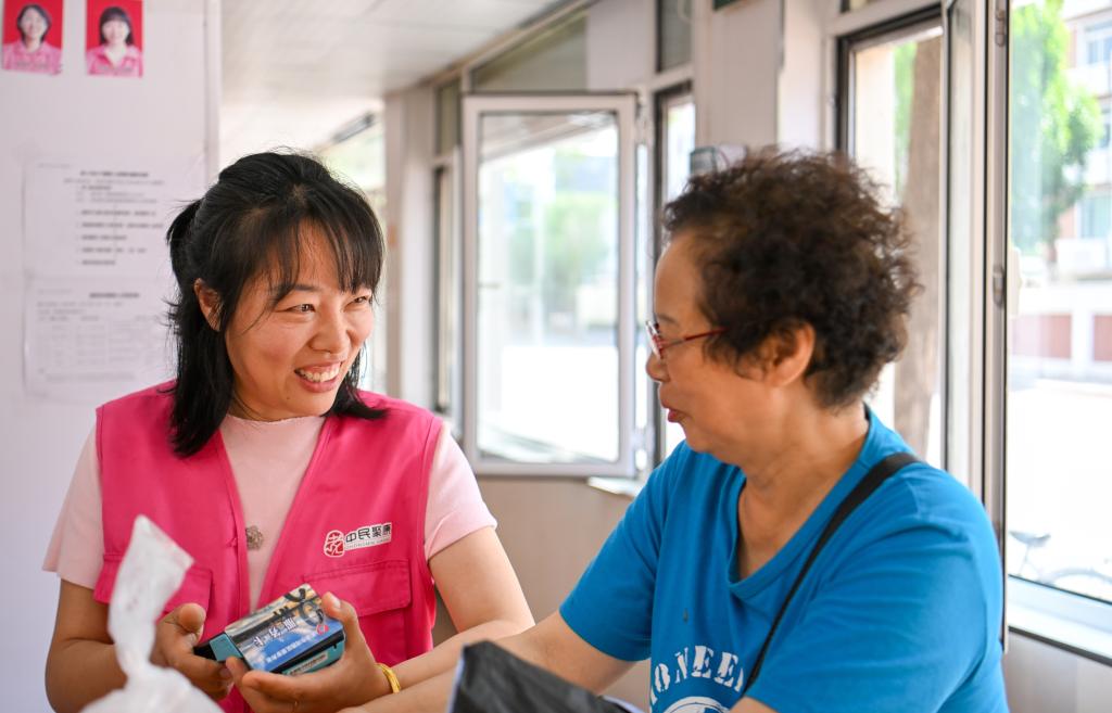 在天津市河西區(qū)賓西樓居家養(yǎng)老服務(wù)中心,劉緩緩(左)為老人辦理業(yè)務(wù)時(shí)與老人聊家常。新華社記者 孫凡越 攝