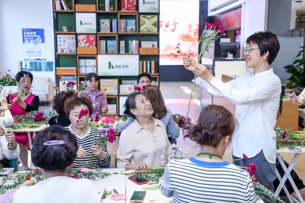 在國(guó)家老年大學(xué)魏公村校區(qū)課堂上,老師黃山正在講授插花課程。(國(guó)家老年大學(xué)供圖)