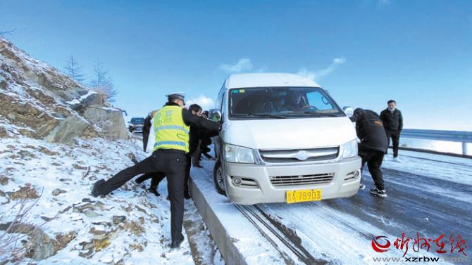 10月16日,五臺(tái)山景區(qū)境內(nèi)出現(xiàn)雨夾雪天氣,伴隨著氣溫下降,部分路段出現(xiàn)積雪。當(dāng)日7時(shí)許,五臺(tái)山公安分局接到游客報(bào)警稱,在景區(qū)北線鴻門巖路段,由于下雪后道路有大量積雪成冰,導(dǎo)致多輛大巴車和轎車受阻無(wú)法通行,請(qǐng)求援助。