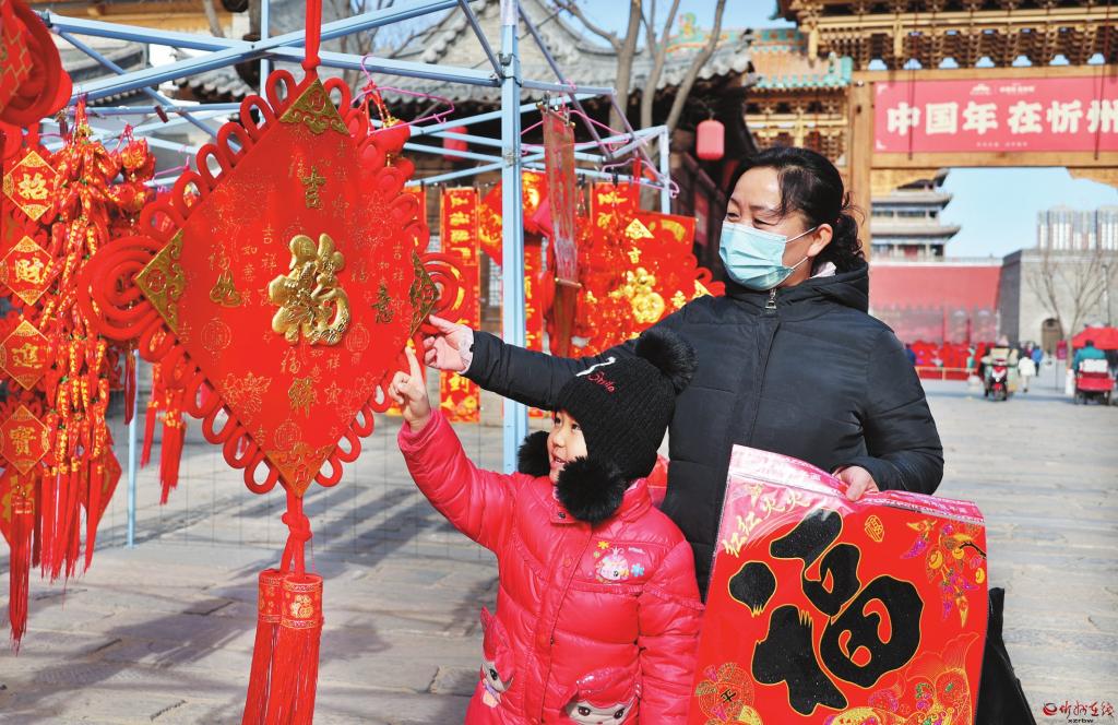 春節(jié)臨近,我市各大商場和年貨市場洋溢著濃濃的年味兒。春聯(lián)、“福”字、“中國結(jié)”等賀歲商品琳瑯滿目,到處都是紅紅火火的過年氣氛。右圖為2月3日,市民在忻州古城南北大街集市上選購年貨。 (張存良 攝)