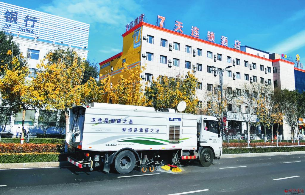 11月10日,高效的環(huán)衛(wèi)洗掃車正在對路面進行清洗作業(yè)。 (
