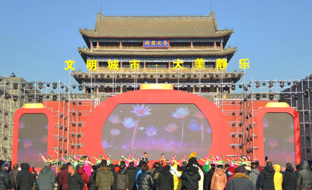 在北城門樓廣場的歌舞現(xiàn)場,二人臺對唱《拜大年》、歌曲《復(fù)興的力量》《牽著春風(fēng)進山村》、舞蹈《幸福中國一起走》、北路梆子《黃河管子聲》選段等精彩的節(jié)目陸續(xù)登臺,贏得廣大市民朋友的陣陣掌聲。