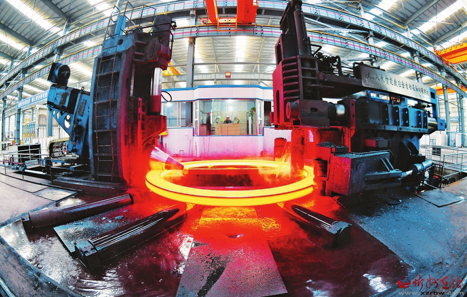 智能數(shù)控全自動(dòng)徑軸向輾環(huán)機(jī)正在進(jìn)行輾環(huán)作業(yè)。 張晉蘭攝