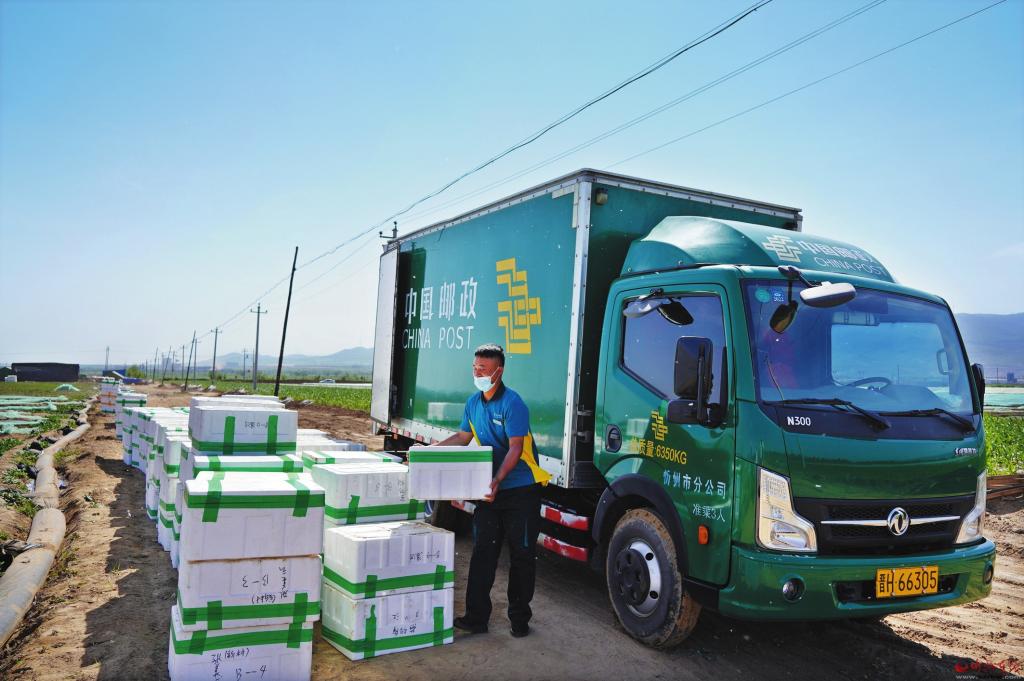 6月18日,天貓網(wǎng)購節(jié),五寨縣郵政公司將郵政運輸車輛直接開到該縣蔬菜生產(chǎn)基地,將新鮮的蔬菜及時發(fā)往全國各地。 張向榮攝