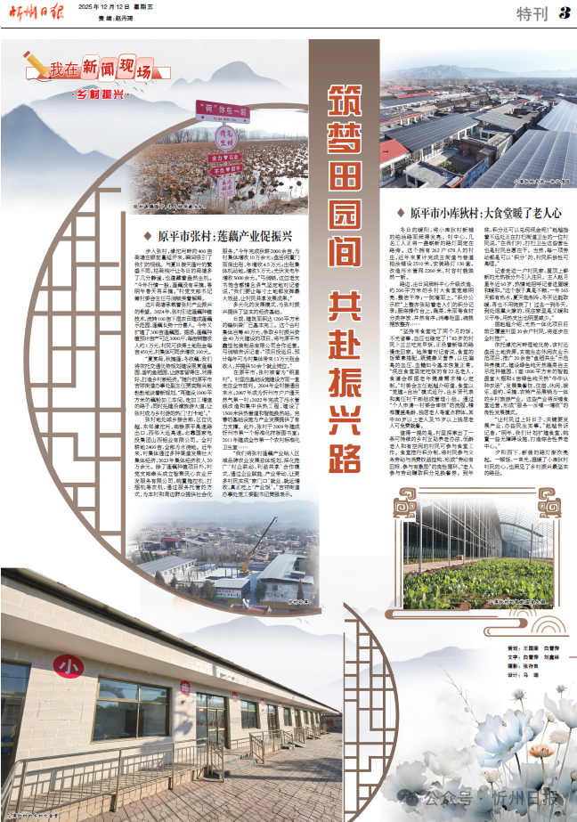 張村地處城鄉(xiāng)接合部,區(qū)位優(yōu)越,東鄰滹沱河,南接原平高速路出口,西鄰大運(yùn)高速,北靠國(guó)家電投集團(tuán)山西鋁業(yè)有限公司。全村耕地2400畝,全部為水澆地。近年來(lái),村集體通過(guò)多種渠道發(fā)展壯大集體經(jīng)濟(jì),2023年集體經(jīng)濟(jì)收入20萬(wàn)余元。除了蓮藕種植項(xiàng)目外,村黨支部牽頭成立智聚民心農(nóng)業(yè)開(kāi)發(fā)服務(wù)有限公司,購(gòu)置拖拉機(jī)、打捆機(jī)等農(nóng)機(jī),通過(guò)服務(wù)托管的方式,為本村和周邊群眾提供社會(huì)化服務(wù)?!敖衲晖瓿汕锔?000余畝,為村集體增收10萬(wàn)余元;盤活閑置門面房出租,年增收4.5萬(wàn)元;出租集體機(jī)動(dòng)地,增收5萬(wàn)元;光伏發(fā)電年增收5000余元。”弓潤(rùn)鎖,這位老支書飽含感情且語(yǔ)氣堅(jiān)定地對(duì)記者說(shuō),“我們要讓每寸土地都發(fā)揮最大效益,讓村民共享發(fā)展成果?!?/p>