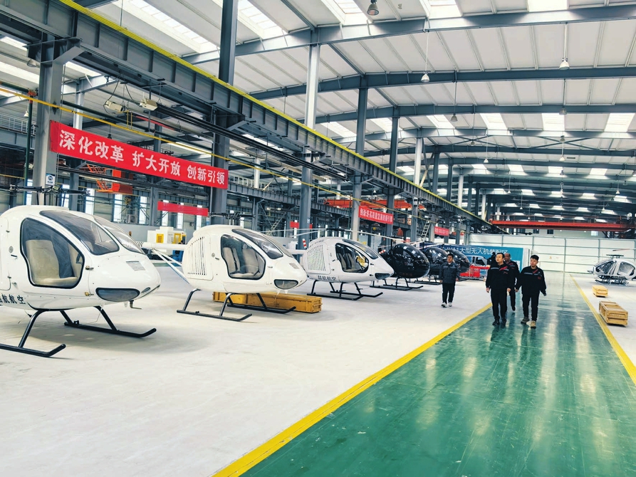 4月11日,山西喆航生產(chǎn)車間內(nèi),工作人員再次檢視準(zhǔn)備交付的ZH281A直升機(jī)。