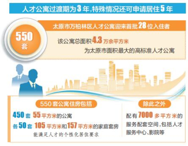 太原市高度重視人才工作,大力實(shí)施人才強(qiáng)市戰(zhàn)略,不斷創(chuàng)新人才政策,優(yōu)化人才生態(tài),為各類人才提供廣闊的發(fā)展舞臺(tái)。作為太原市的核心城區(qū),萬(wàn)柏林區(qū)搶抓打造人才高地的重大機(jī)遇,精心建設(shè)拎包入住、設(shè)施齊全、服務(wù)優(yōu)質(zhì)的高品質(zhì)人才公寓。550套公寓住房包括450套55平方米的公寓、105平方米和157平方米的家庭套房各50套,能滿足人才的個(gè)性化居住要求。除此之外,還配有7000多平方米的服務(wù)配套空間,包括人才服務(wù)中心、影院、餐廳、書(shū)吧、健身房、創(chuàng)客空間等。