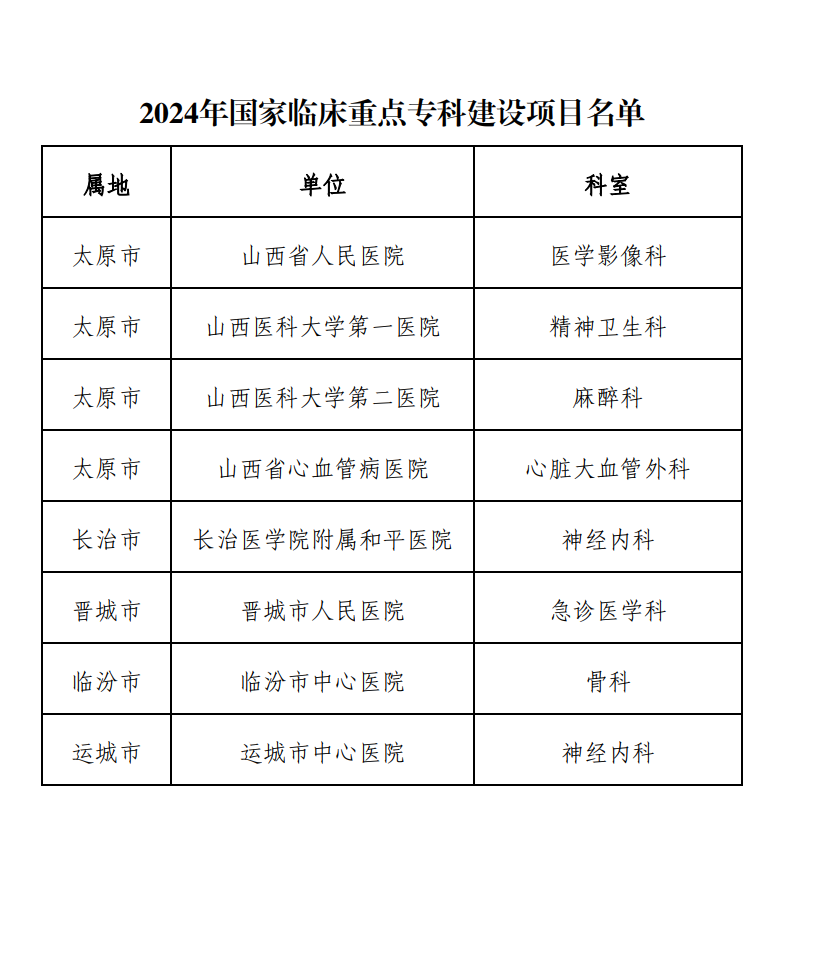 黃河新聞網(wǎng)訊(記者孫宇佳)日前,山西省衛(wèi)健委對擬確定為2024年國家臨床重點專科建設(shè)項目的醫(yī)院及??泼麊芜M行了公示。據(jù)悉,本次名單根據(jù)《山西省衛(wèi)生健康委辦公室關(guān)于印發(fā)〈“十四五”期間山西省臨床重點專科建設(shè)實施方案〉的通知》和國家臨床重點??平ㄔO(shè)項目申報工作總體安排,在各市衛(wèi)生健康委和委直屬有關(guān)醫(yī)院積極申報后,經(jīng)山西省衛(wèi)生健康委組織省醫(yī)療服務評價中心和省級專家進行評審后產(chǎn)生。