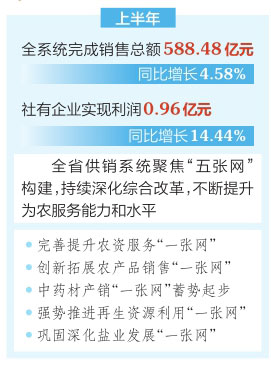 本報訊(記者高瑋)7月21日,全省供銷系統(tǒng)上半年經(jīng)濟(jì)運行分析暨“五張網(wǎng)”構(gòu)建現(xiàn)場推進(jìn)會在長治市武鄉(xiāng)縣召開。今年以來,全省供銷系統(tǒng)以“五張網(wǎng)”構(gòu)建為統(tǒng)領(lǐng),推動供銷工作全面提質(zhì)增效,經(jīng)濟(jì)運行穩(wěn)定向好。上半年,全系統(tǒng)完成銷售總額588.48億元,同比增長4.58%;社有企業(yè)實現(xiàn)利潤0.96億元,同比增長14.44%。