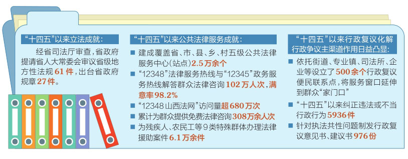 11月20日上午,中共山西省委宣傳部、山西省人民政府新聞辦公室舉行“高質(zhì)量完成‘十四五’規(guī)劃”系列主題第六場新聞發(fā)布會,省司法廳有關(guān)負責同志介紹“十四五”期間我省司法行政工作情況,并回答記者提問。 法治是中國式現(xiàn)代化的重要保障?!笆奈濉币詠?,全省司法行政系統(tǒng)深入踐行習近平法治思想,緊緊圍繞省委、省政府重大決策部署和發(fā)展戰(zhàn)略,充分發(fā)揮職能,拓展工作成效,為推動山西高質(zhì)量發(fā)展提供了堅實的法治保障。 以法治之力賦能經(jīng)濟發(fā)展 “十四五”期間,我省堅持改革和法治相統(tǒng)一,確保重大改革于法有據(jù)?!笆奈濉币詠?,經(jīng)省司法廳審查,省政府提請省人大常委會審議省級地方性法規(guī)61件,出臺省政府規(guī)章27件,《山西省煤炭清潔高效利用促進條例》《山西省旅游發(fā)展促進條例》對深入推進能源革命,加快把文化旅游業(yè)培育成為支柱產(chǎn)業(yè),助力資源型經(jīng)濟轉(zhuǎn)型發(fā)展提供了制度支撐。《山西省黃河流域生態(tài)保護和高質(zhì)量發(fā)展條例》將生態(tài)環(huán)境保護實踐中行之有效的政策制度,通過行政立法及時上升為法律制度,用法治力量讓母親河水量豐起來、水質(zhì)好起來、風光美起來。 法治是最好的營商環(huán)境?!笆奈濉逼陂g,我省出臺《山西省民營經(jīng)濟發(fā)展促進條例》《山西省反不正當競爭條例》,開展不平等對待企業(yè)的法規(guī)政策專項清理工作,營造穩(wěn)定、公平、透明、可預期的發(fā)展環(huán)境。圍繞市場主體反映強烈的執(zhí)法檢查問題,開展提升行政執(zhí)法質(zhì)量三年行動,嚴格落實規(guī)范涉企行政檢查“22條”,推行“綜合一次查”和掃碼入企等舉措,讓企業(yè)擺脫頻繁迎檢的困擾,實現(xiàn)檢查行為全程留痕、可追溯。同時,圍繞營商環(huán)境、道路交通安全、食品藥品監(jiān)管等重點領(lǐng)域,“小切口”開展法治督察,及時發(fā)現(xiàn)法治實踐中的問題并切實推動整改。 今年,全省各級司法行政部門按照黨中央和省委、省政府部署,在全省范圍內(nèi)開展規(guī)范涉企行政執(zhí)法專項行動。通過線索征集、案卷評查、實地走訪等方式,全面排查企業(yè)和群眾反映強烈的突出問題,采取掛牌督辦、約談提醒等措施,推動解決各類問題2238個。今年前三季度,全省涉企行政檢查次數(shù)同比減少10.2萬次,但檢查發(fā)現(xiàn)問題的比例提升了5.16%,實現(xiàn)了“無事不擾”與“精準監(jiān)管”的有機結(jié)合。 以法治之力助力民生改善 增進民生福祉是發(fā)展的根本目的,也是司法行政工作的“必答題”。“十四五”以來,我省持續(xù)加強民生領(lǐng)域立法,針對群眾關(guān)心的外賣食品安全問題,小切口制定《山西省網(wǎng)絡(luò)餐飲服務(wù)食品安全監(jiān)督管理暫行辦法》。 實施“法治為民”實事專項攻堅,省市兩級共完成“法治為民”實事500余件。開展“法護春苗”工作,統(tǒng)籌22個省直部門從制度建設(shè)、執(zhí)法監(jiān)管、司法保護、法治教育和幫扶救助等方面協(xié)同發(fā)力,為全省中小學配備法治副校長7048名,有力筑牢未成年人保護的法治屏障。協(xié)調(diào)各部門扎實辦好整治拖欠民營企業(yè)賬款、完善經(jīng)濟困難失能老年人照護服務(wù)制度等事項。創(chuàng)新建立服刑人員、強制隔離戒毒人員與家屬遠程視頻會見系統(tǒng),累計開展視頻會見21萬次,有效解決了家屬因身體不便、經(jīng)濟困難、交通不便等原因?qū)е碌摹皶婋y”問題。 加快建設(shè)覆蓋城鄉(xiāng)、便捷高效、均等普惠的現(xiàn)代公共法律服務(wù)體系。連續(xù)7年實施“免費法律咨詢和特殊群體法律援助惠民工程”,累計為群眾提供免費法律咨詢308萬余人次,為殘疾人、農(nóng)民工等9類特殊群體辦理法律援助案件6.1萬余件。推行114項公證“最多跑一次”,試點開通“互聯(lián)網(wǎng)仲裁”業(yè)務(wù),修訂《山西省法律援助條例》,全面推行法律援助“市域通辦”,讓群眾從“最多跑一次”變?yōu)椤熬徒芤淮巍?,甚至“一次不用跑”。打造“半小時公共法律服務(wù)圈”,建成覆蓋省、市、縣、鄉(xiāng)、村五級公共法律服務(wù)中心(站點)2.5萬余個,發(fā)布“半小時公共法律服務(wù)圈”站點導航,歸并整合“12348”法律服務(wù)熱線與“12345”政務(wù)服務(wù)熱線,面向群眾提供“7×24小時”不打烊服務(wù)。 以法治之力深化社會治理 “十四五”以來,全省司法行政系統(tǒng)堅持和發(fā)展新時代“楓橋經(jīng)驗”,以法治力量維護社會和諧穩(wěn)定,助力建設(shè)更高水平的平安山西、法治山西。 “十四五”期間,我省深化以人民調(diào)解為基礎(chǔ)、各類調(diào)解銜接聯(lián)動的工作格局,推動一村(居)一法律顧問與調(diào)解工作深度融合,將調(diào)解服務(wù)嵌入網(wǎng)格化管理體系,讓群眾真正體會到了“糾紛有人管、矛盾就地解”。全省建成2.4萬個調(diào)解組織,調(diào)解員達到8.8萬名,累計化解各類矛盾糾紛60余萬件。 注重從“兩代表一委員”、退休政法干警、律師、“法律明白人”等群體中選聘優(yōu)秀調(diào)解員,通過組織開展新時代“楓橋經(jīng)驗”精品課程進基層等活動,加強對調(diào)解員的專業(yè)化、系