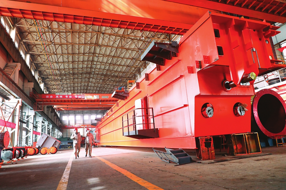 太重集團(tuán)起重機(jī)分公司車間,即將發(fā)往印度AMNS公司的450t鑄造起重機(jī)正在進(jìn)行拆車包裝作業(yè)。武劍峰攝
