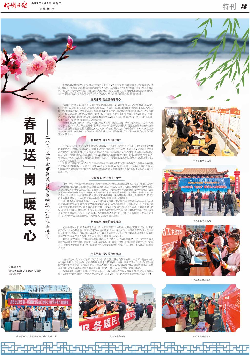 春潮涌動(dòng),萬物競發(fā)。在黨的二十大精神的指引下,我市以“春風(fēng)行動(dòng)”為抓手,錨定就業(yè)優(yōu)先戰(zhàn)略,掀起了一場覆蓋全域、精準(zhǔn)施策的就業(yè)服務(wù)熱潮。從代縣文昌祠廣場的崗位“盛宴”到五寨縣迎賓廣場的鄉(xiāng)村振興專場招聘,從偏關(guān)縣太虎坡文化廣場的“龍?zhí)ь^”古會(huì)到易地搬遷安置點(diǎn)的暖心服務(wù),一場場招聘會(huì)如春風(fēng)化雨,潤澤萬千求職者的心田,為忻州高質(zhì)量發(fā)展增添蓬勃生機(jī)。