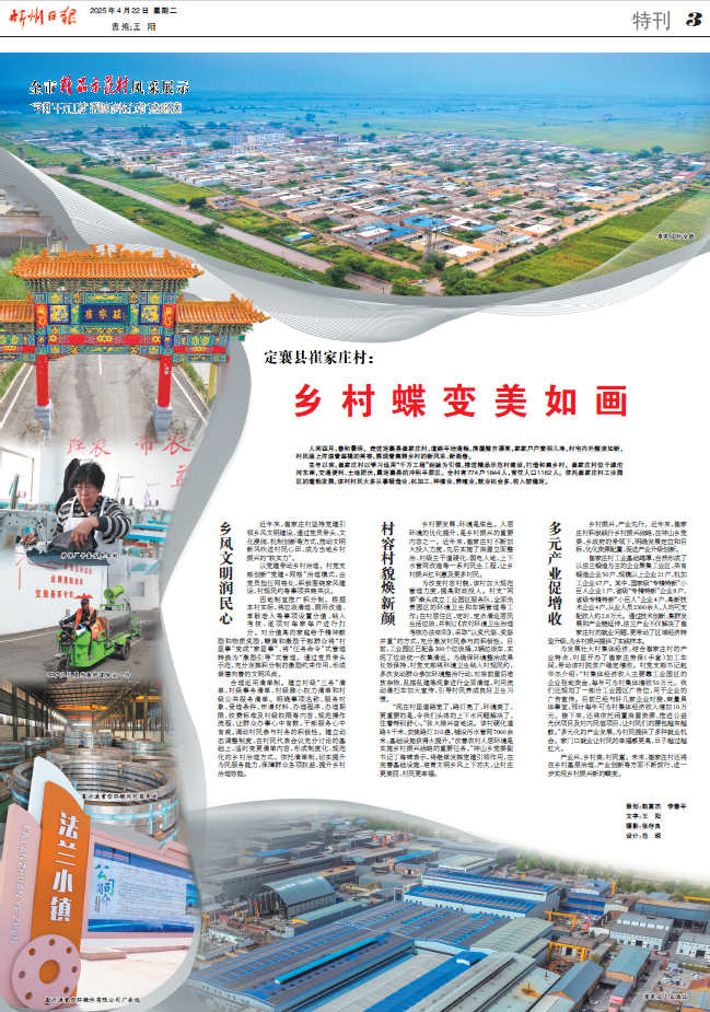 崔家莊村工業(yè)基礎(chǔ)雄厚,自然形成了以法蘭鍛造為主的企業(yè)聚集工業(yè)區(qū),共有鍛造企業(yè)50戶,規(guī)模以上企業(yè)21戶,機(jī)加工企業(yè)67戶。其中,國(guó)家級(jí)“專精特新”小巨人企業(yè)1戶,省級(jí)“專精特新”企業(yè)8戶,省級(jí)專精特新“小巨人”企業(yè)4戶,高新技術(shù)企業(yè)4戶,從業(yè)人員2300余人,人均可支配收入約2.8萬(wàn)元。通過(guò)技術(shù)創(chuàng)新、集群發(fā)展和產(chǎn)業(yè)鏈延伸,法蘭產(chǎn)業(yè)不僅解決了崔家莊村的就業(yè)問(wèn)題,更帶動(dòng)了區(qū)域經(jīng)濟(jì)轉(zhuǎn)型升級(jí),為鄉(xiāng)村振興提供了實(shí)踐樣本。