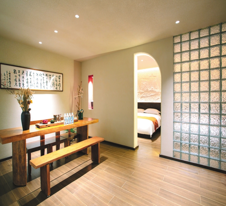牧瑤溫泉民宿位于忻府區(qū)南關村。走進院內(nèi),大片玻璃窗通透明亮,門前蒼松與其他綠植讓人心曠神怡,潺潺流水和中式亭子的造景,增添了許多的靈動韻味。