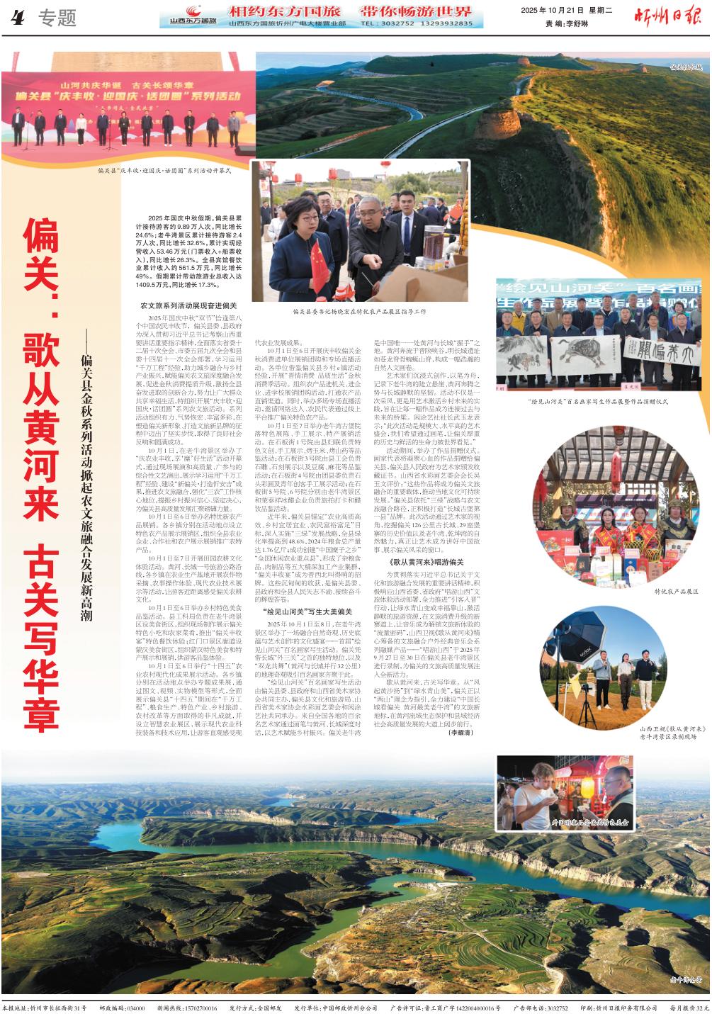 2025年國(guó)慶中秋“雙節(jié)”恰逢第八個(gè)中國(guó)農(nóng)民豐收節(jié),偏關(guān)縣委、縣政府為深入貫徹習(xí)近平總書記考察山西重要講話重要指示精神,全面落實(shí)省委十二屆十次全會(huì)、市委五屆九次全會(huì)和縣委十四屆十一次全會(huì)部署,學(xué)習(xí)運(yùn)用“千萬(wàn)工程”經(jīng)驗(yàn),助力城鄉(xiāng)融合與鄉(xiāng)村產(chǎn)業(yè)振興,賦能偏關(guān)農(nóng)文旅深度融合發(fā)展,促進(jìn)金秋消費(fèi)提質(zhì)升級(jí),激揚(yáng)全縣奮發(fā)進(jìn)取的創(chuàng)新合力,努力讓廣大群眾共享幸福生活,特組織開展“慶豐收·迎國(guó)慶·話團(tuán)圓”系列農(nóng)文旅活動(dòng)。系列活動(dòng)組織有力、氣勢(shì)恢宏、豐富多彩,在塑造偏關(guān)新形象、打造文旅新品牌的征程中邁出了堅(jiān)實(shí)步伐,取得了良好社會(huì)反響和圓滿成功。