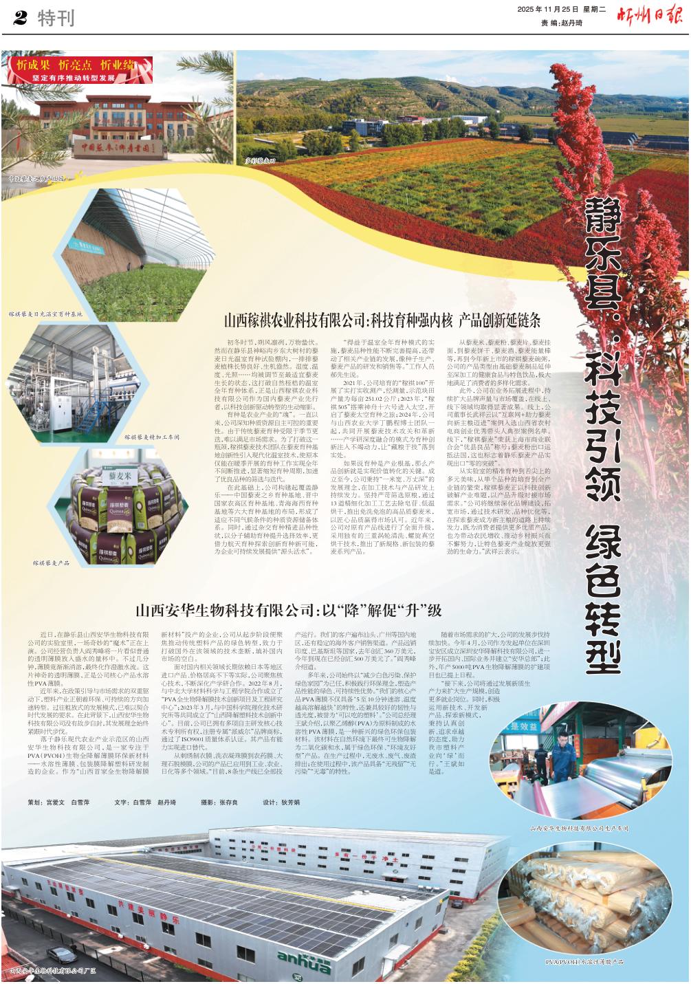落子靜樂現(xiàn)代農(nóng)業(yè)產(chǎn)業(yè)示范區(qū)的山西安華生物科技有限公司,是一家專注于PVA(PVOH)生物全降解薄膜環(huán)保新材料——水溶性薄膜、包裝膜降解塑料研發(fā)制造的企業(yè)。作為“山西首家全生物降解膜新材料”投產(chǎn)的企業(yè),公司從起步階段便聚焦推動(dòng)傳統(tǒng)塑料產(chǎn)品的綠色轉(zhuǎn)型,致力于打破國外在該領(lǐng)域的技術(shù)壟斷,填補(bǔ)國內(nèi)市場的空白。