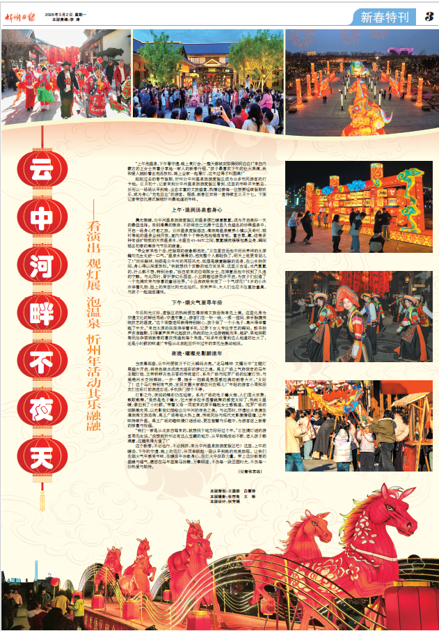 剛剛過(guò)去的春節(jié)假期,忻州云中河溫泉旅游度假區(qū)成為眾多市民游客的打卡地。正月初十,記者來(lái)到云中河溫泉旅游度假區(qū)看到,這里的年味并未散去,反而以一場(chǎng)場(chǎng)從早到晚、業(yè)態(tài)豐富的文旅盛宴,熱情迎接每一位想要延續(xù)假期歡樂(lè)、或?yàn)樯硇摹俺潆娀匮钡挠慰?。?jù)悉,新春狂歡將一直持續(xù)至正月十七。下面記者帶您沉浸式解鎖忻州最地道的年味。
