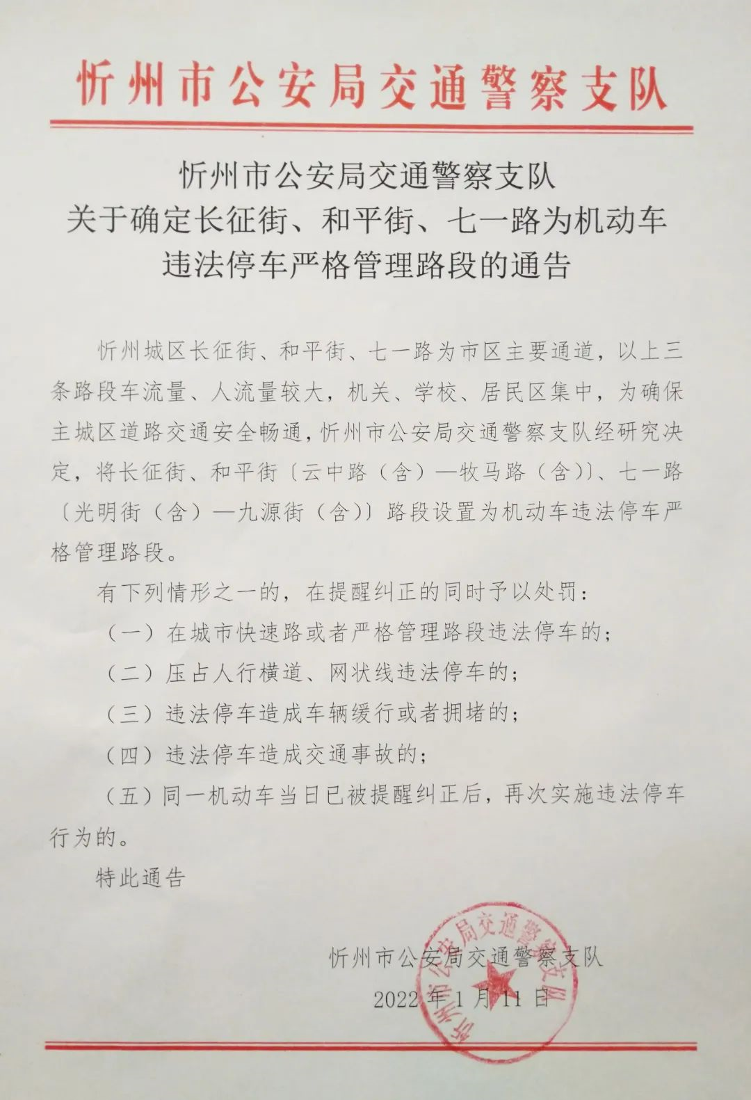 忻州城區(qū)長征街、和平街、七一路為市區(qū)主要通道,以上三條路段車流量、人流量較大,機(jī)關(guān)、學(xué)校、居民區(qū)集中,為確保主城區(qū)道路交通安全暢通,忻州市公安局交通警察支隊(duì)經(jīng)研究決定,將長征街、和平街[云中路(含)-牧馬路(含)]、七一路[光明街(含)-九原街(含)]路段設(shè)置為機(jī)動(dòng)車違法停車嚴(yán)格管理路段。
