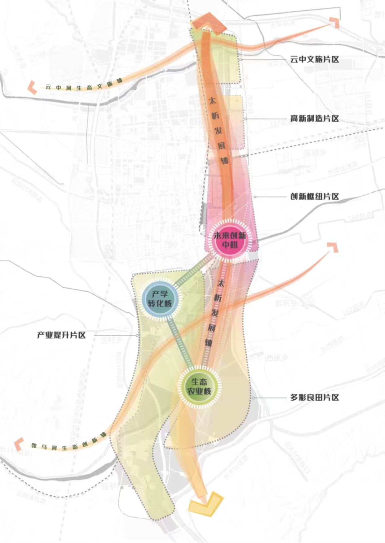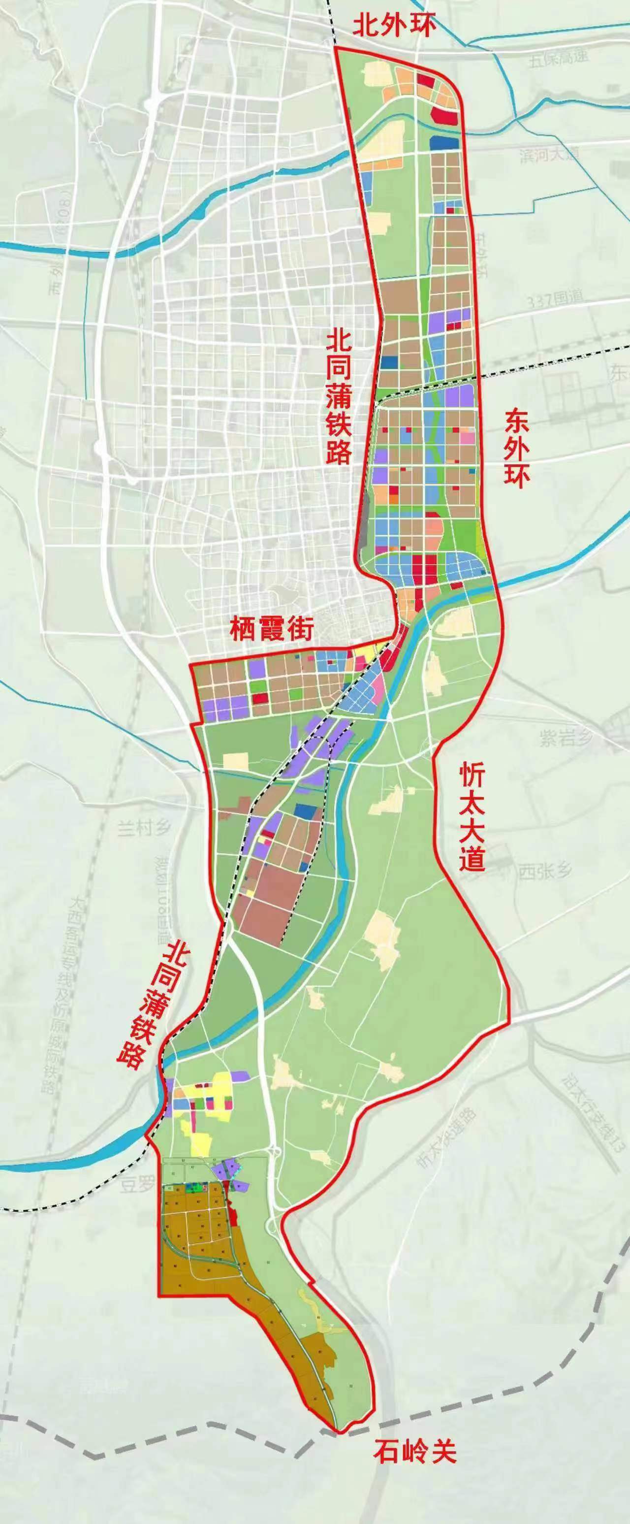 規(guī)劃面積約100平方公里,北至北外環(huán),南至石嶺關(guān)(太原界),西至北同蒲鐵路,東至東外環(huán)。新區(qū)作為太忻一體化經(jīng)濟(jì)區(qū)忻州片區(qū)的啟動(dòng)區(qū),堅(jiān)持生態(tài)優(yōu)先、綠色發(fā)展,統(tǒng)籌生活、生態(tài)、生產(chǎn)三大空間,以“一心雙核、三軸五片區(qū)”規(guī)劃布局,預(yù)留未來產(chǎn)業(yè)發(fā)展用地,重點(diǎn)發(fā)展雜糧產(chǎn)業(yè)、現(xiàn)代物流產(chǎn)業(yè)、新能源材料產(chǎn)業(yè)、文旅產(chǎn)業(yè)和科技創(chuàng)新智造產(chǎn)業(yè),北部打造高新制造集合體、云中河?xùn)|段打造休閑度假文旅區(qū)、中部打造創(chuàng)新樞紐核心區(qū)、西南部打造產(chǎn)業(yè)提升區(qū)、東南部打造多彩良田示范區(qū),形成與大盂產(chǎn)業(yè)新城南北呼應(yīng)之勢。