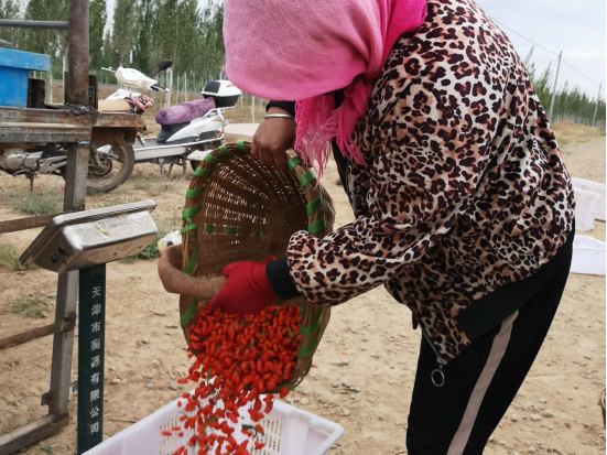 像菊花臺這樣的枸杞種植基地,同心縣一共有4個。同心縣探索實施產(chǎn)業(yè)流轉(zhuǎn)模式,先后引進了潤德、菊花臺、德谷、盛坤等有機枸杞種植、深加工企業(yè),打造了四大枸杞種植基地。枸杞采摘高峰期,四個枸杞基地中有近萬人參與枸杞采摘,全年勞務(wù)費用支出2.8億元左右,農(nóng)民人均收入增加5000元以上,枸杞產(chǎn)業(yè)成為移民群眾脫貧增收的“綠色銀行”。
