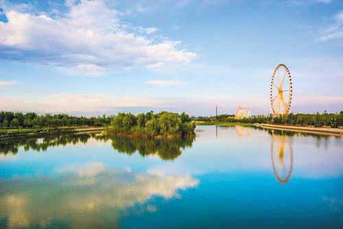 沿著河岸邊的石板路緩緩向西前行,手中撫過(guò)岸邊的花崗石欄桿,偶有微風(fēng)拂面,帶起耳畔凌亂的發(fā)絲,讓人頓覺(jué)神清氣爽,想要沉醉在眼前的迷人風(fēng)光中。這時(shí),不遠(yuǎn)處忽然傳來(lái)人們的歡呼聲和尖叫聲,我上前一看,原來(lái)已經(jīng)走到了云中河游樂(lè)園。游樂(lè)園里的娛樂(lè)項(xiàng)目多樣,其中最醒目的便是那高達(dá)88米、修建時(shí)高度居山西第一的摩天輪,伴隨著悅耳的歌謠,摩天輪緩緩地轉(zhuǎn)動(dòng)著,帶著人們對(duì)浪漫的遐想。