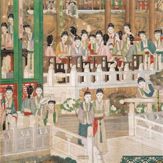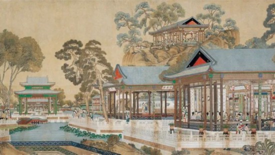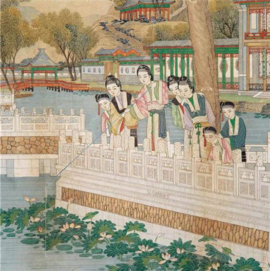 畫面中,曲折縈紆的溪水自蘅蕪院流經(jīng)牡丹亭、凹晶館、蓼風(fēng)軒、秋爽齋等地,最終蜿蜒向畫面遠(yuǎn)方,層層亭臺(tái)廊橋,一望無盡。許軍杰認(rèn)為,此繪之溪水應(yīng)為沁芳溪。正如周汝昌先生在《北京大觀園·引言》中評(píng)價(jià):“大觀園全部的主脈與‘靈魂’是一條蜿若游龍的‘沁芳溪’。亭、橋、泉、閘,皆以此二字為名,可為明證。一切景觀,依溪為境”,“大觀園的一切池、臺(tái)、館、泉、石、林、塘,皆以沁芳溪為大脈絡(luò)而盤旋布置。”圖中的這曲溪水亦有異曲同工之功能,將兩岸建筑、山石、樹木巧妙地聯(lián)系在一起,使其形成一個(gè)有機(jī)的園林整體。(李君娜)