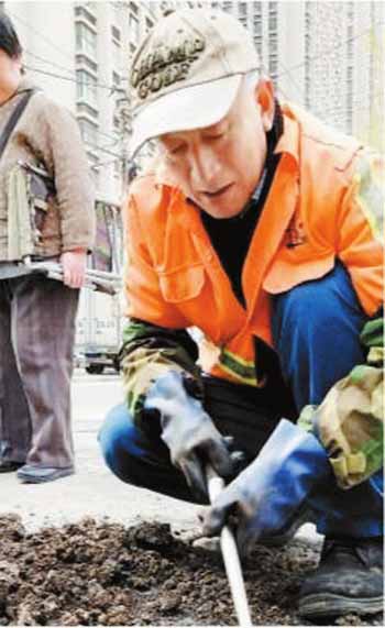 “漏點就在馬路牙子下面一米深的地方?!崩咸K早練就了一雙解決難題的“火眼金睛”。話音未落,他就拿出自制工具,撬開路牙石往下掏挖。
